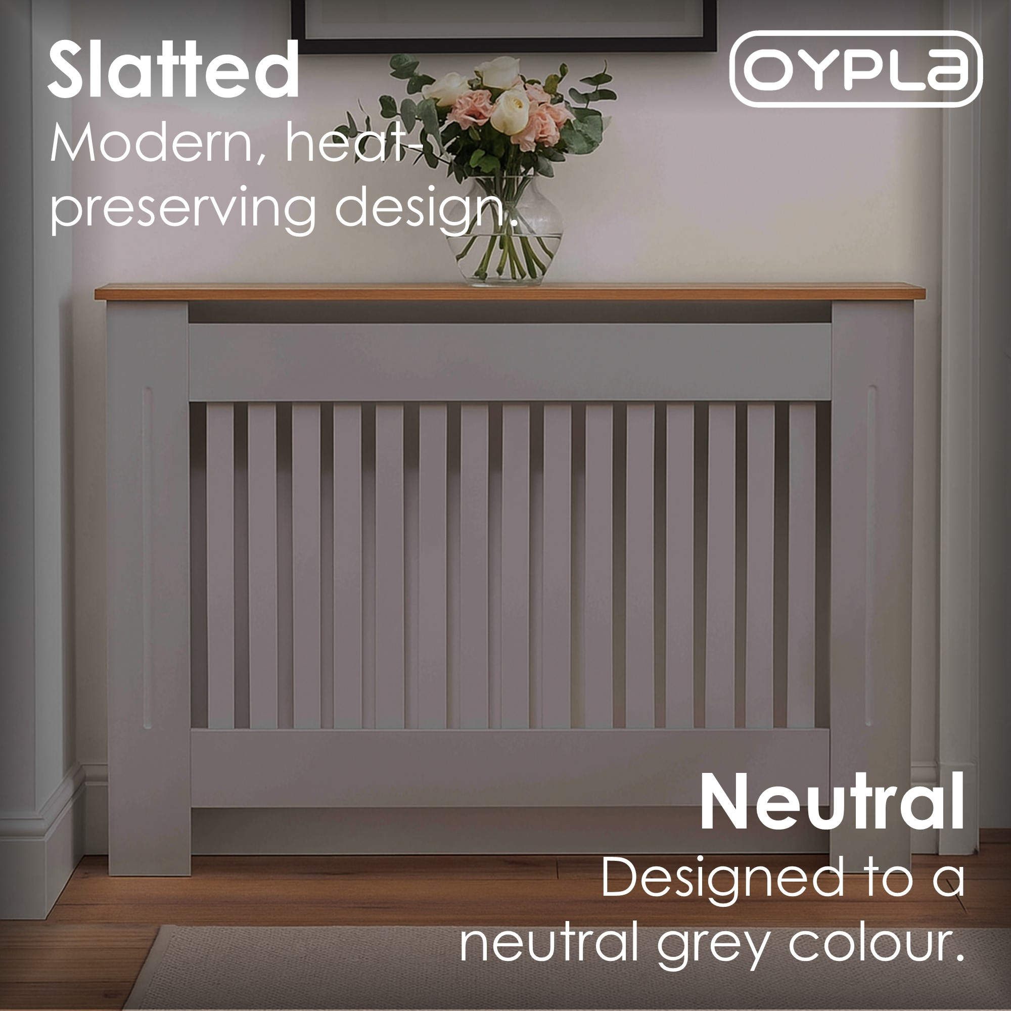 The radiator cover is perfect for covering unsightly radiators and adding some extra style to your home. The cover is made from high quality MDF with a grey finish perfect for blending into the decor of your room and provides a handy oak-effect shelf for extra storage on top. The slatted design of the cover allows for improved air circulation to dissipate the heat throughout the room and also helps to prevent children from burning their fingers on the radiator. The cover also includes fittings for securely mounting it to a wall.