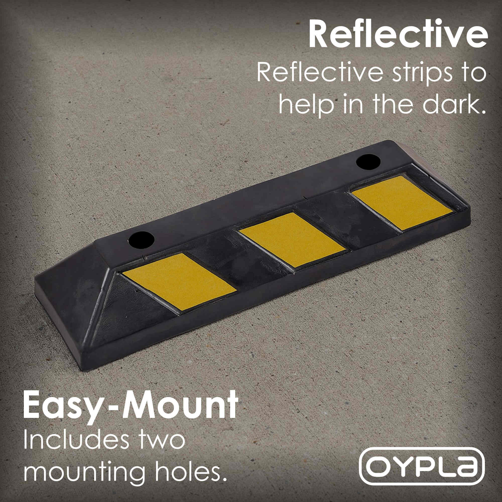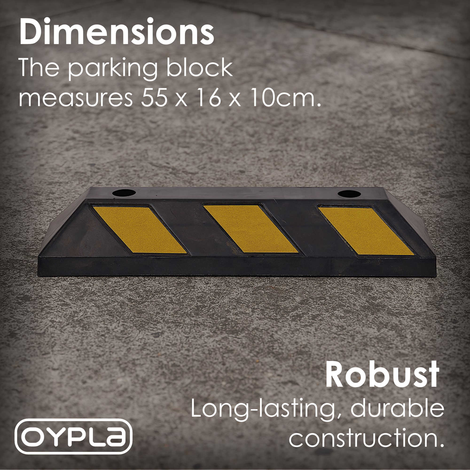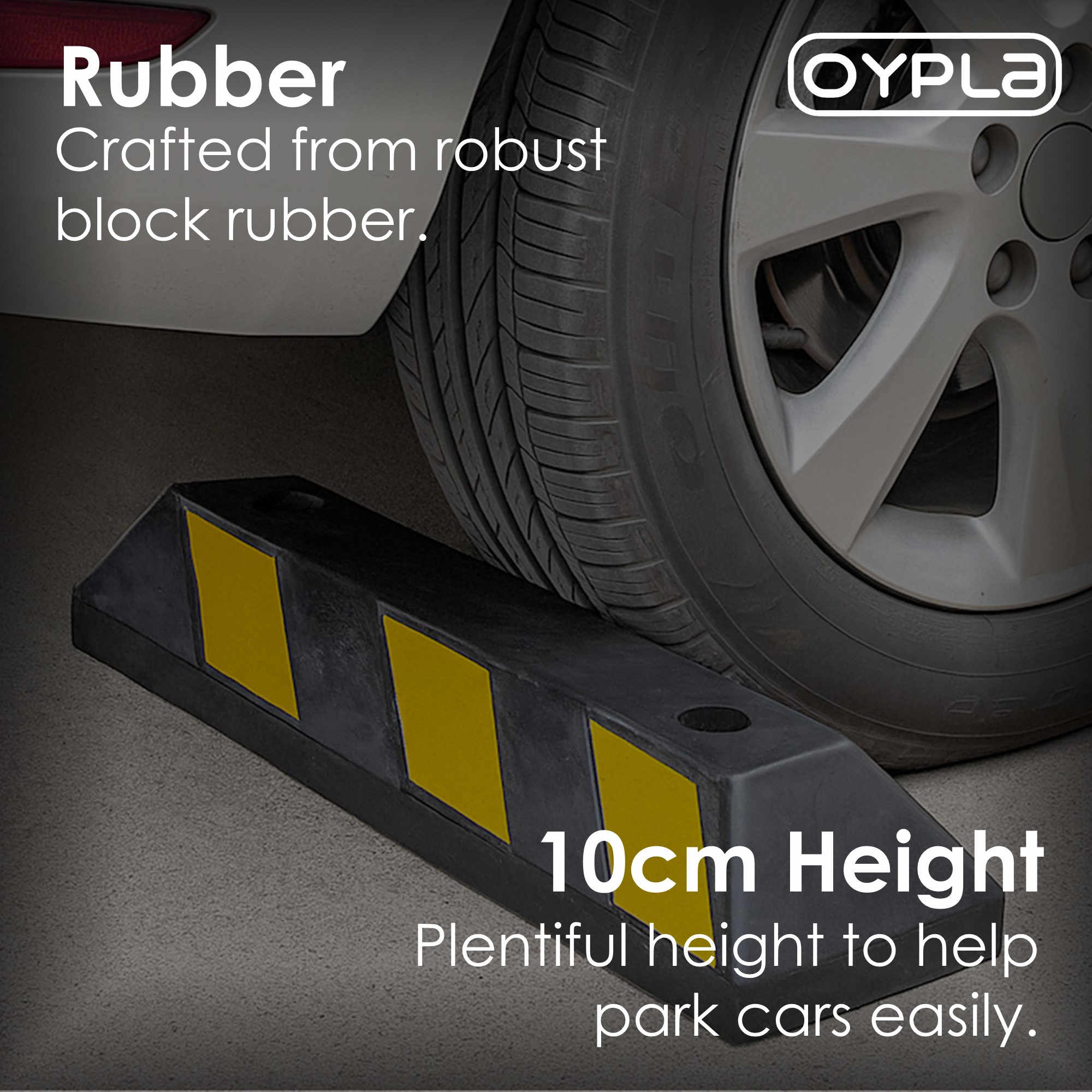 Prevent your car overrunning the parking space and hitting garage walls or other cars with the wheel stop. The stop is made from heavy duty and hard wearing rubber for maximum durability and resistance to the elements as well as oil and grease. The stop is 10cm tall making it suitable for cars with lower ride height. The stop includes yellow reflective strips to improve visibility at night or in dark conditions. The stop also includes holes for permanent installation.