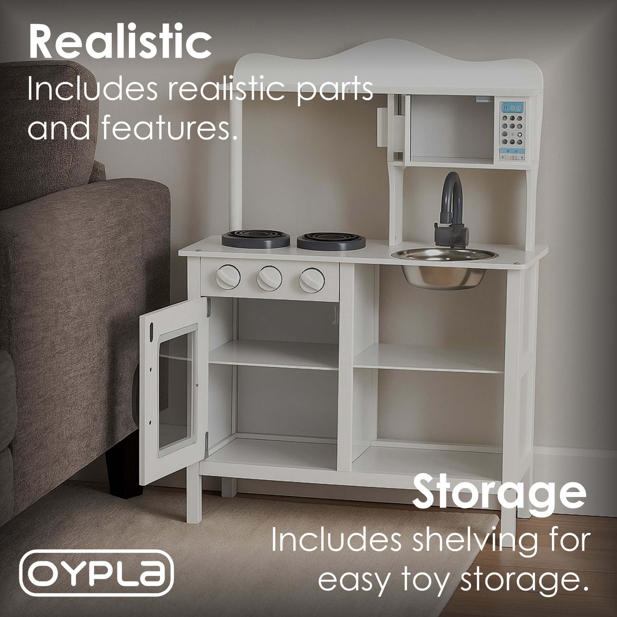 The kitchen play set encourages role playing and is great for developing hand / eye coordination in your kids. It is easy to assemble, and with lots of little tasks to do, it is sure to keep your children busy for many hours of cooking fun. Just like a real kitchen, it features a proper oven with two hobs, two shelves, and movable dials, an opening microwave, a real stainless steel sink with swivelling tap, and lots of additional shelf space for imaginary ingredients. The kitchen is manufactured from high quality MDF with a glossy white finish, ensuring it survives for many years at the hands of even the most vigorous of little chefs.