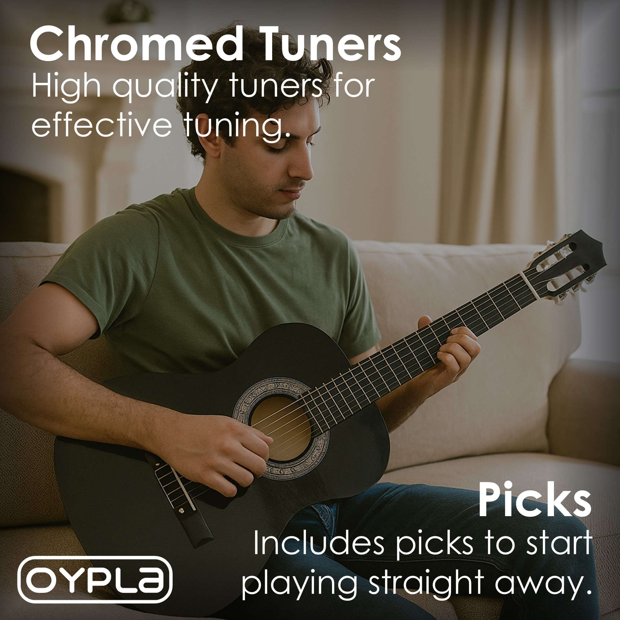 Perfect for children and beginners, our 34" acoustic guitar is a high quality instrument! The body is a high quality basswood with a gloss varnish finish, with a rosewood fingerboard and bridge to ensure a great tone regardless of your experience level. High quality chromed tuners are fitted to the headstock to help ensure you guitar stays in tune, and it's large hand assembled body gives a great tone with smooth top end and warm mellow bass tones.