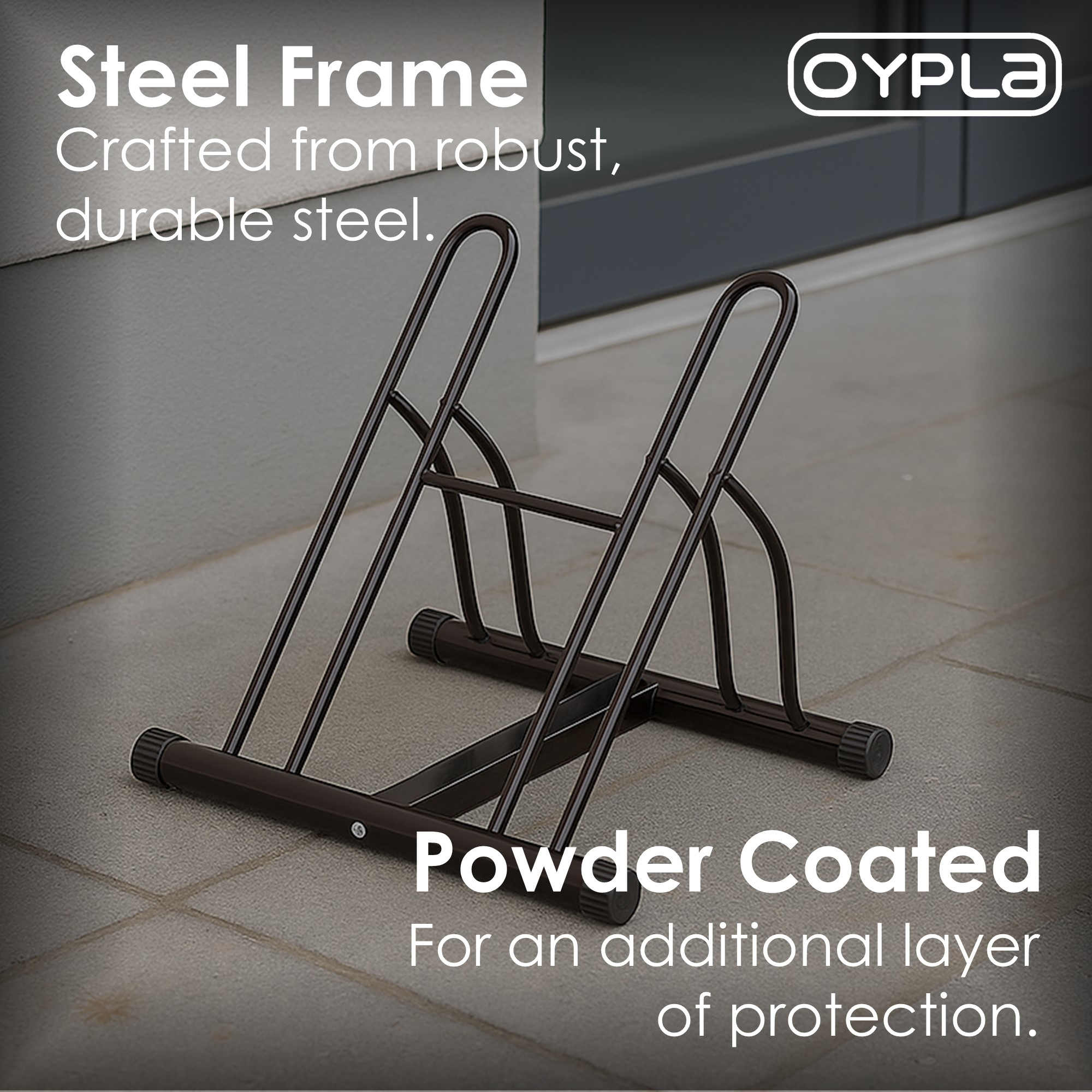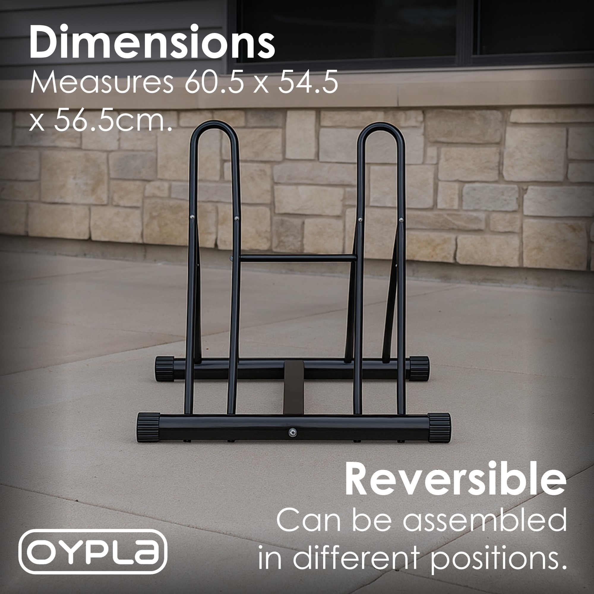 The bike stand allows you to store your bike in an upright position securely and easily. Since the only contact points are on the wheel, the stand will not touch or mark the frame in any way. The holder is suitable for any wheel up to 64mm wide and provides 32cm space between bikes. The stand is made from heavy duty steel making it suitable for both indoor and outdoor use.